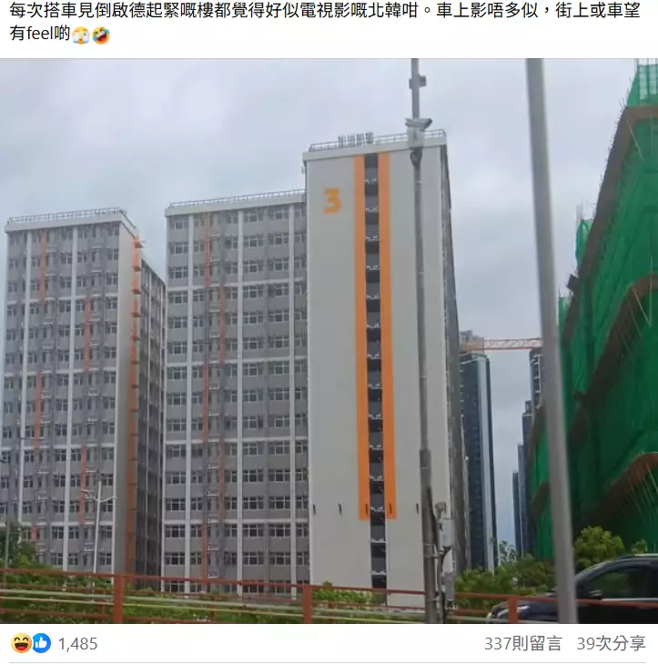港女在貼文中提到「每次搭車見倒啟德起緊嘅樓,都覺得好似電視影嘅北韓咁。車上影唔多似,街上或車望有feel啲」。由她發布的相片所見,啟德簡約公屋主要以灰白色為主調,再搭配上橙色的線條,外形四四方方,每個樓層的窗戶都排列得整齊有序,猶如積木砌成般。而每座亦會油上大大隻數字,代表其座號。