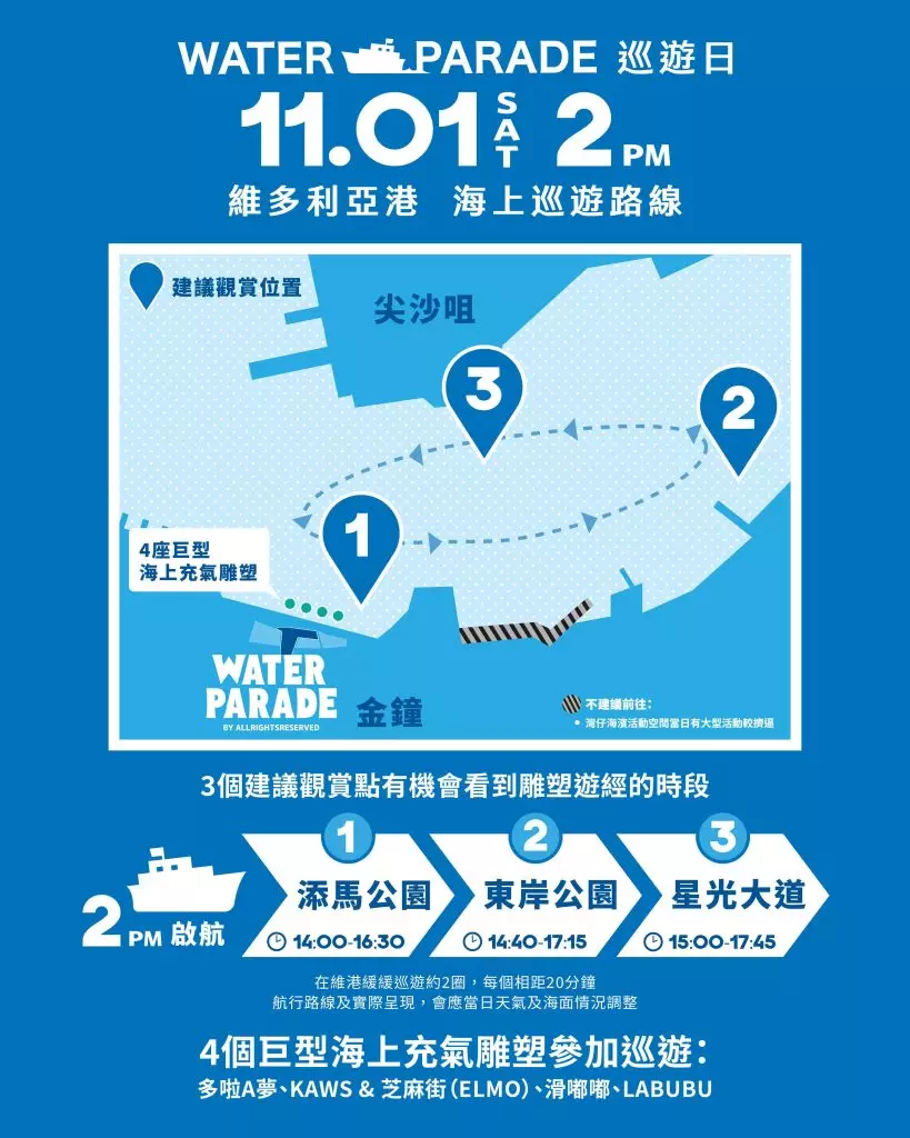 全球首創「維港海上大巡遊」將於11月1日壓軸登場,四座巨型雕塑將於當日下午2時起漫遊維港兩岸,由添馬公園出發,經炮台山橫越維港前往尖沙咀海面,再折返金鐘海域來回兩圈,當日主辦方會於主要港鐵站廣播報路,帶領市民旅客前往觀賞巡遊。