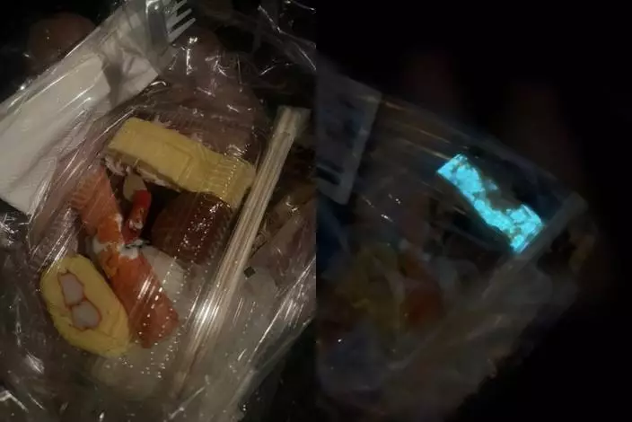 泰國一名網民日前外賣壽司後,意外發現其中一件壽司竟然發出螢光藍,令他非常驚訝。有專家指出可能是生物發光菌造成污染,建議民眾切勿食用。