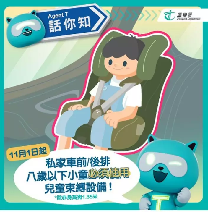 運輸署提醒市民,11月1日起,8歲以下兒童除非身高達1.35米,否則不論坐在私家車前或後座,均須使用兒童束縛設備,如兒童安全座椅。8歲或以上兒童或身高至少1.35米者,則須使用兒童束縛設備或佩戴成人安全帶。