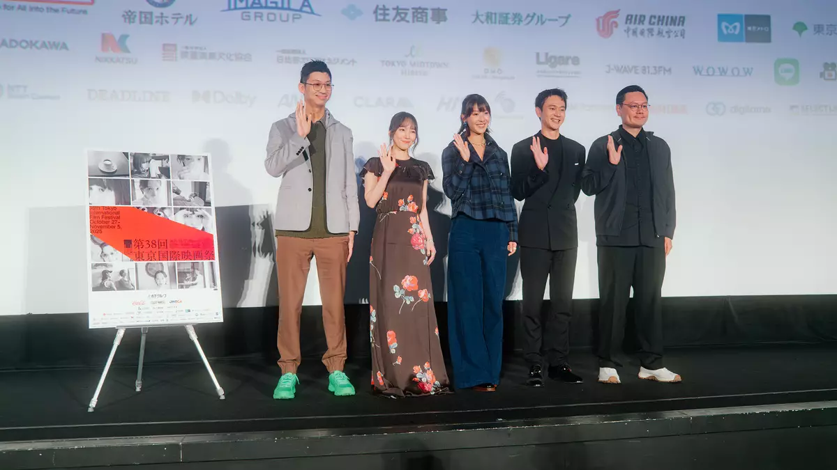 (左起)劉冠廷、余香凝、吉岡里帆、導演許承傑、監製苗華川,共同出席東京國際影展。(「水花電影、2025 TIFF提供)
