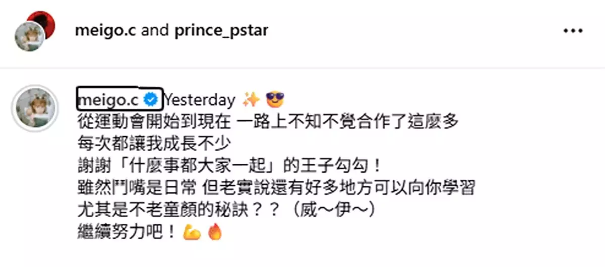 二人過去因《全明星運動會》結緣,合作後不時公開同遊、合照。事件爆出後,二人互動被網民翻出,原來早於年初合作代言時,粿粿就曾甜蜜留言:「從運動會開始到現在,一路上不知不覺合作了這麼多,每次都讓我成長不少,謝謝『什麼事都大家一起』的王子勾勾。」一句「王子勾勾」即時成為焦點,網民話:「暱稱太親密啦!」