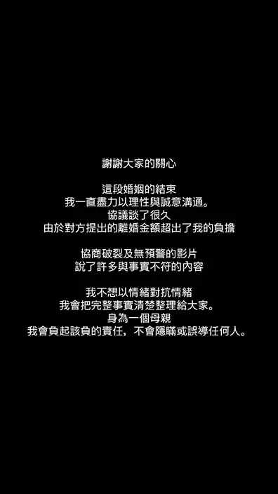 面對風暴,粿粿與王子相繼出面澄清,但說法卻出現明顯落差。粿粿強調,婚姻早已陷入長期僵局,雙方正進行協議離婚程序,並否認多項指控,只表示會繼續承擔母親責任。王子則發文認錯,坦言:「我不是破壞家庭關係的人,但在傾聽對方經歷的過程中,因心疼而越界。錯誤就是錯誤,沒有藉口。」
