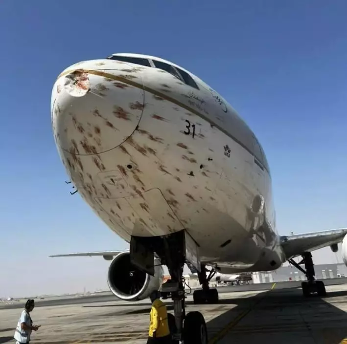 沙特阿拉伯航空波音客機起飛不久與候鳥相撞,血濺機身機鼻凹陷,所幸最終安全降落。