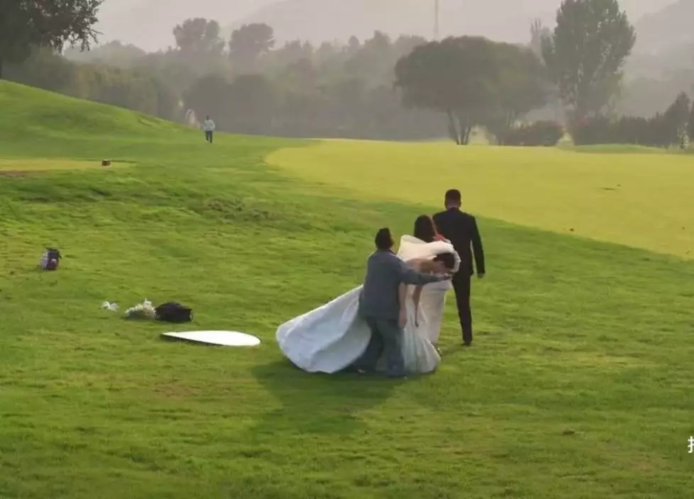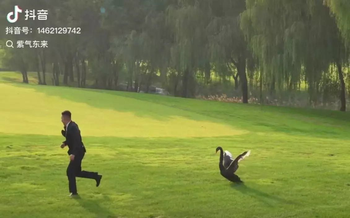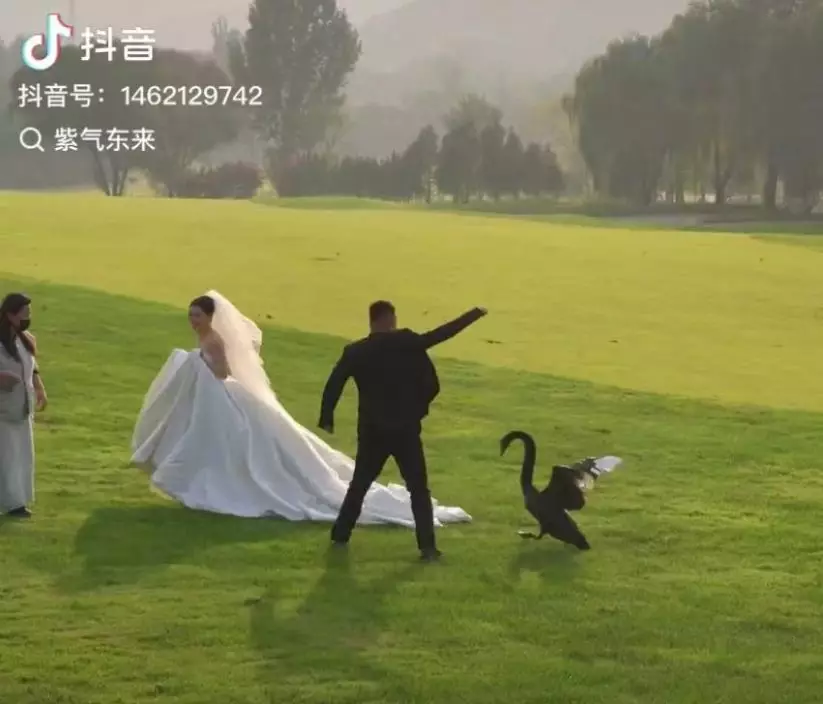 綜合內媒報導,山東濟南一對新人早前在草坪上拍攝婚紗照時,意外遭遇一隻黑天鵝「攪局」。事發當時,新人換好服裝後,正與攝影師及化妝師一同在草坪上準備拍照。結果,一隻黑天鵝突然展翅拍打直衝向身穿白紗的新娘,新郎見狀立即拿起捧花擋在前面嘗試驅趕,惟黑天鵝仍不斷向前衝,甚至踩上新娘的婚紗,場面驚險又滑稽。