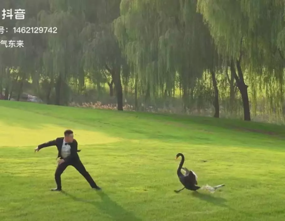 最終,新郎抬腳作勢驅退,才成功化解這場突如其來的「襲擊」。新郎孫先生透露,這隻黑天鵝體型龐大,直立起來幾乎與人等高,新娘當下驚慌失措,而他則本能地想保護妻子。他推測,黑天鵝或是被白色婚紗吸引誤以為「入侵者」,所幸雙方均無受傷,也未造成任何損害。