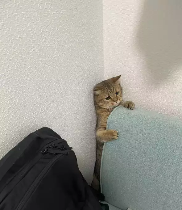 照片可見,貓貓用爪子緊抓梳化椅背,僅能用後腳撐地,全程動彈不得,耳朵微微下垂,眼神中滿是無助與困惑,彷彿在訴說:「為什麼會這樣?」