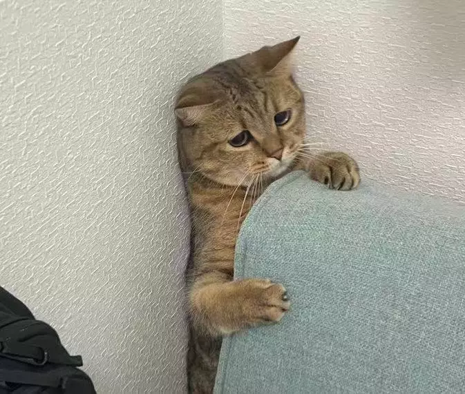 貓爪緊抓梳化椅背 眼神無助困惑