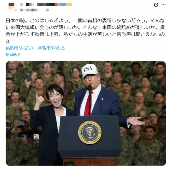 例如在社交平台X上就出現了「高市別幹了」(高市やめろ)的話題,有網民甚至憤怒地表示,真是「日本的恥辱」,認為高市的過度「興奮」,不像是一個國家首相該有的,有網民說「你跟美國總統見面就這麽開心嗎?舔美國的鞋子就這麽快樂嗎?工資停滯不前,物價飛漲,我們的生活越來越艱難,這些聲音你聽不到嗎?」,該評論獲得超過1600次轉發和6000點讚。