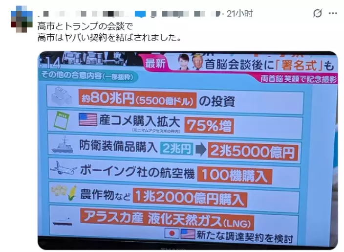 日美雙方今次還簽署了《邁向美日同盟新黃金時代協議》和《日美關鍵礦產合作框架協議》。但有網民指,高市與美方簽了個糟糕的協議,帖文還附帶了日本電視節目片段截圖,顯示日本將對美國進行合計5500億美元的投資、把進口美國大米數量擴大75%、購買25000億日元的美國武器、購買100架波音飛機、購買12000億的美國農產品、購買美國液化天然氣等。帖文轉發已過萬,點讚數早已超過2.9萬。