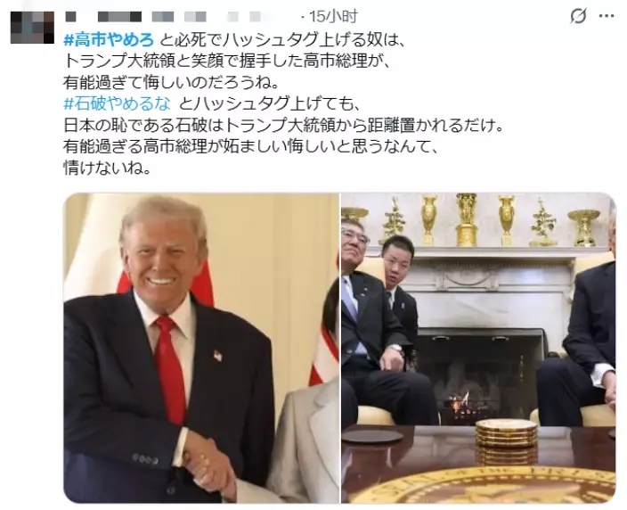 不過,高市也有支持者,指她能和特朗普微笑著握手實在是太有才幹了,反觀之下,前首相石破茂才是日本的恥辱,他只會和特朗普保持距離,該帖文也獲得數千點讚。