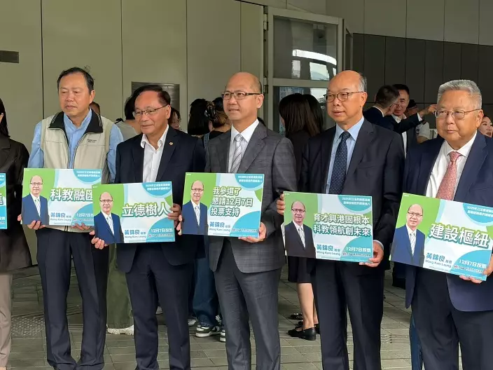 港區人大代表、教聯會主席黃錦良亦宣布競逐選委界,他早上在陳帆等人陪同下宣布參選。巴士的報記者攝