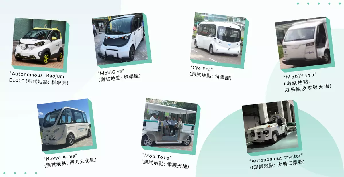 獲批准的測試項目,包括涉及7輛以自動駕駛操作的公共小型巴士,往來大橋香港口岸與航天城。另一個牌照,涉及批准10輛自動車在啟德發展區及九龍灣指定路段進行測試。