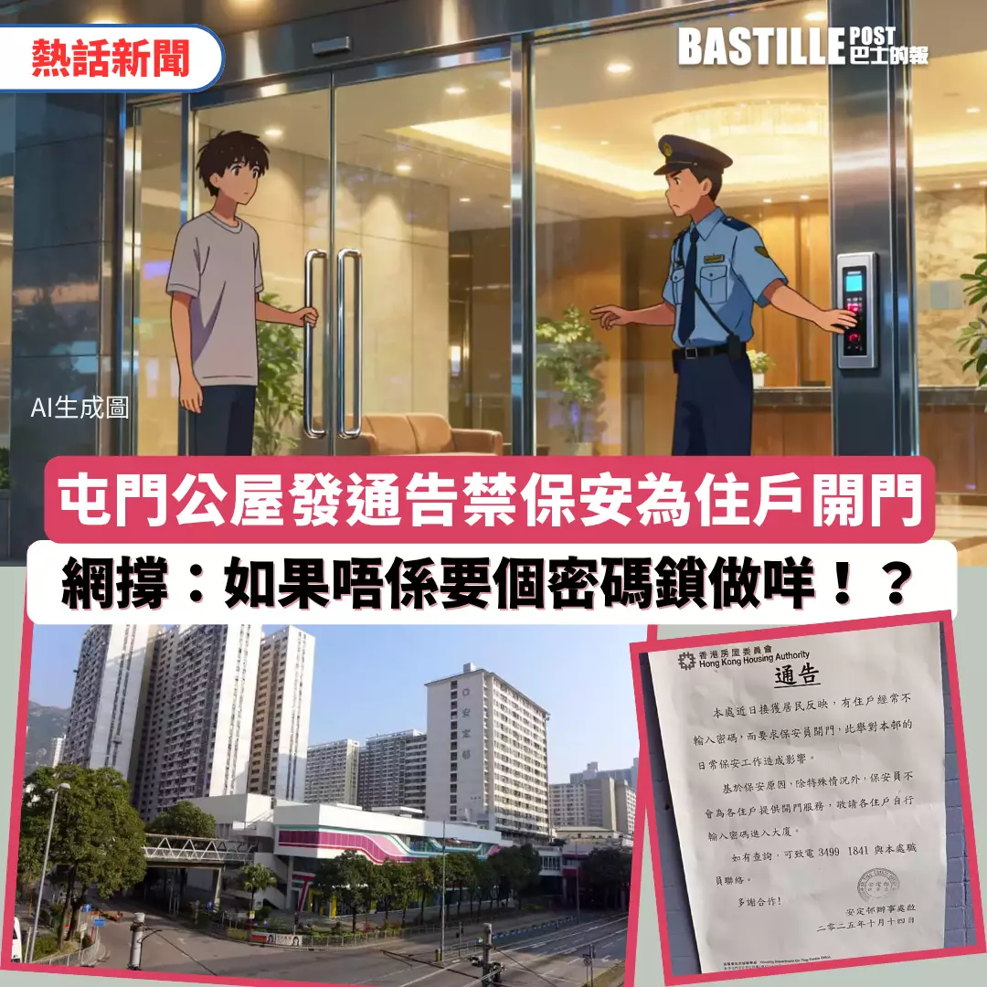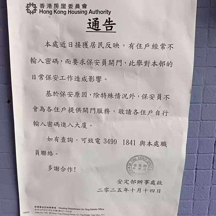 有網民在社交平台的FB專頁發文,分享屯門安定邨的通告。通告上解釋由於近日收到居反映,指有住戶進入大廈時,經常不輸入密碼,要求保安員開門,因而「對本邨的日常保安工作造成影響。」因此「基於保安原因,除特殊情況外,保安員不會為各住戶提供開門服務,敬請各住戶自行輸入密碼進入大廈。」而通告是由房委會「安定邨辦事處」於10月14日發出。