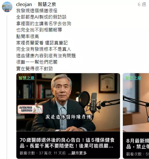 一位台灣網友日前在社群平台Threads上發文,表示家中長輩熱衷觀看該頻道影片,卻不知道這些所謂的「專家」、「醫生」訪談全是AI虛構內容。他寫道:「我發現這個頻道很怪,全部都是AI製成的假訪談,拿裡面的主講者名字去Google,也完全找不到相關報導,點閱率很高,家裡長輩愛看,還認真筆記,完全沒有發現根本不是真人。這些健康內容到底有沒有問題,很難一一幫他們把關,實在覺得很不對勁」。