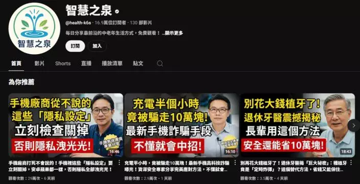「智慧之泉」頻道自2016年在台灣創建,至今已上傳162部影片,擁有超過20萬訂閱者,累積觀看次數近1900萬。頻道介紹中宣稱:「每日分享最前沿的中老年生活方式,免費觀看!我將努力確保我的內容來自可靠的來源,並且是基於科學的事實證明」。儘管如此,許多網友指出,其影片內容大多為AI合成,且明顯針對長者族群設計。YouTube平台雖在每部影片下方標註「經過修改或合成的內容,聲音或畫面經過大幅編輯或數位產生」,但這項提示需要點開影片詳情才能看見。