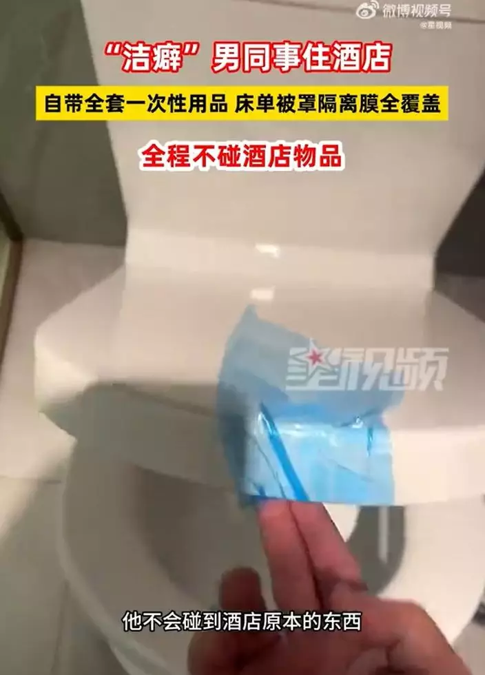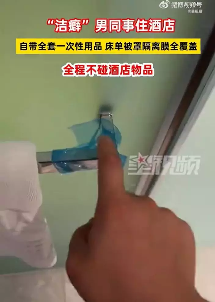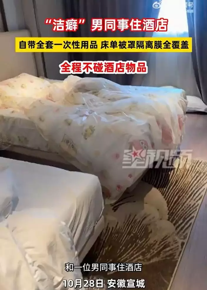 安徽宣城一名男子拍片分享近日入住酒店時,採取的極致衛生措施。他全程不使用酒店內任何物品,自備一次性床單、被罩甚至水龍頭保護膜,引發網絡熱議。涉事酒店對此回應稱,酒店嚴格執行四星級衛生標準,並推測客人可能只是「不習慣」使用酒店用品。
