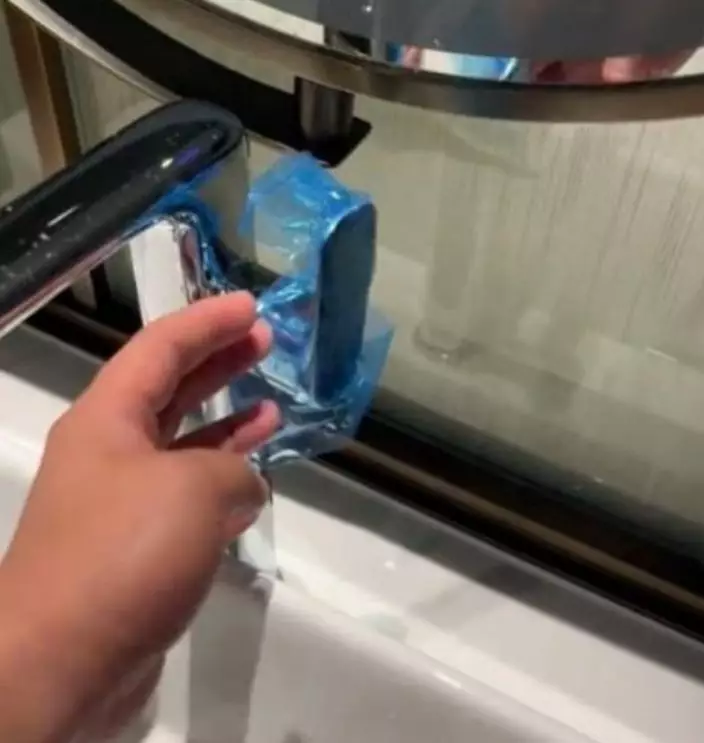 據當事人拍攝的畫面顯示,他與同事入住酒店時,同事攜帶了完整的一次性用品套裝。不僅將床單、被罩全面覆蓋,更用藍色保護膜貼附於水喉把手、廁所門把手及馬桶座圈等接觸點,確保完全不直接觸碰酒店設施。