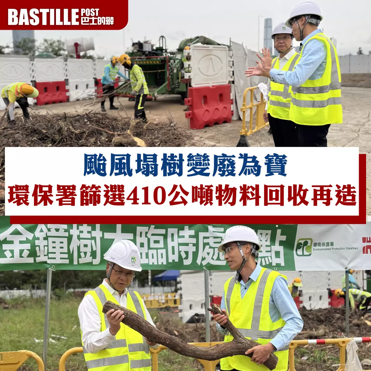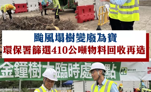 超強颱風樺加沙早前吹襲香港,環保署試行在近市區的3個地點,包括沙田、青衣及金鐘,設立「樹木臨時處理點」。署方說,共接收超過570公噸塌樹物料,當中篩選出約410公噸物料適合回收再造。物料經破碎處理後,運輸所需車次由原本約130車次,大幅縮減至現時約90車次,效率提升外,也減少碳排放。