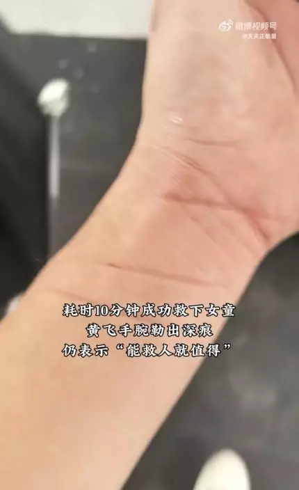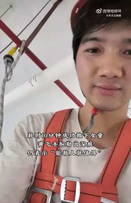 危急關頭,對面樓一名電工黃飛聽到哭聲後,立刻放下手上工作,沿走廊逐間房搜尋來源。確認位置後,他毫不猶豫攀上6樓窗台並翻出狹窄空間,左手緊抓窗沿,右手則舉起紅色塑膠凳給女童墊腳,支撐長達10分鐘。期間,他的手腕被防盜窗勒出深痕,仍堅持不鬆手。