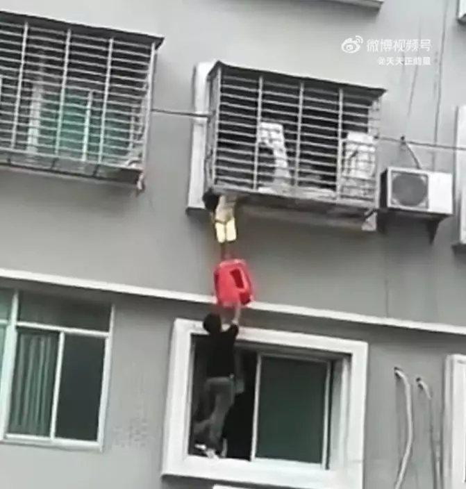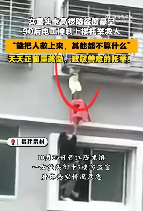 福建一名女童頭卡7樓防盜窗雙腳懸空,幸獲一名熱心電工舉凳托舉10分鐘得以安全獲救。
