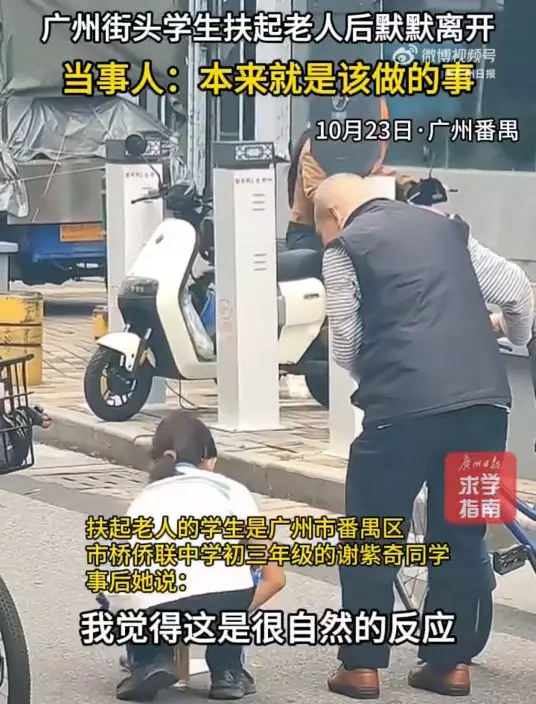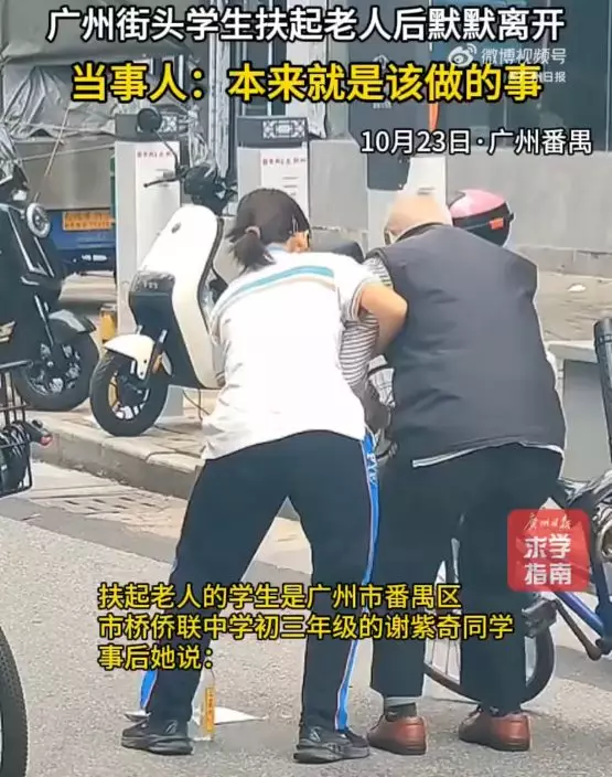 事後,媒體找到片中女學生,確認她是廣州市番禺區市橋僑聯中學初三學生謝紫奇。她受訪時表示,當時看到老翁摔倒起不來,第一反應就是上前幫忙,「這是很自然的反應,看到別人有困難搭把手,本來就是該做的事。」母親也透露,對女兒的行為並不感到意外,認為這是很人之常情的事,加上女兒自幼性格熱情且樂於助人,而自己也一向以身作則,向她灌輸助人為樂的觀念,「平時會從日常小事講道理,讓她明白善良是一種力量」。