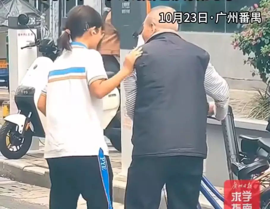 綜合內媒報道,廣州番禺區市橋街道於10月23日下午2時許上演一幕溫情畫面,一名老翁騎乘電動單車時不慎摔倒,周圍路人見狀猶豫不決,均不敢貿然上前扶起老翁。關鍵時刻,一名身穿藍白校服的女學生見狀毫不遲疑停下,並上前伸出援手。