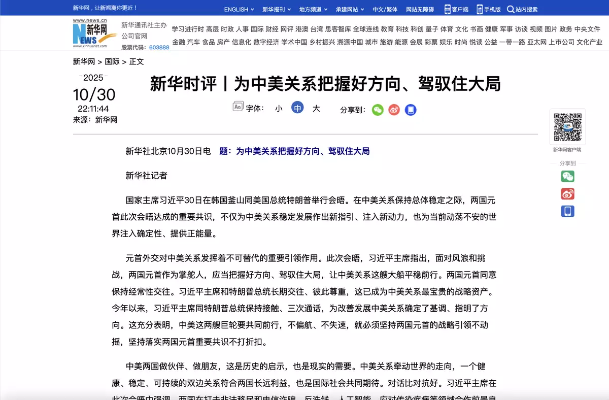 國家主席習近平在南韓釜山同美國總統特朗普結束會晤。新華社發表時評說,在中美關係保持總體穩定之際,兩國元首此次會晤達成的重要共識,不僅為中美關係穩定發展作出新指引、注入新動力,也為當前動盪不安的世界注入確定性、提供正能量。