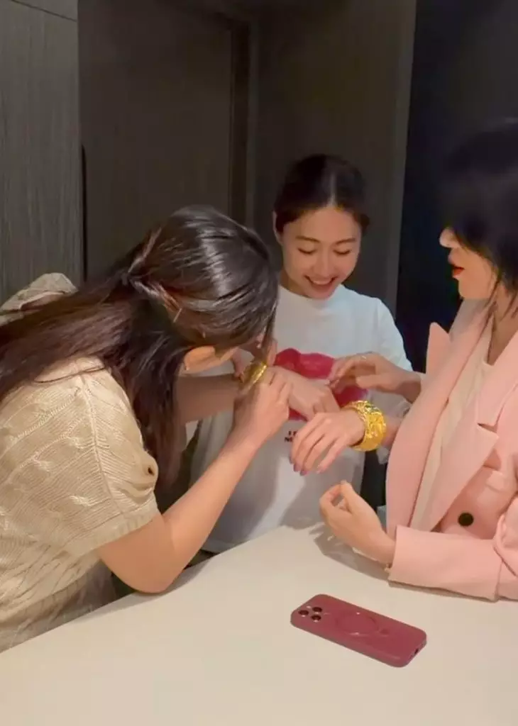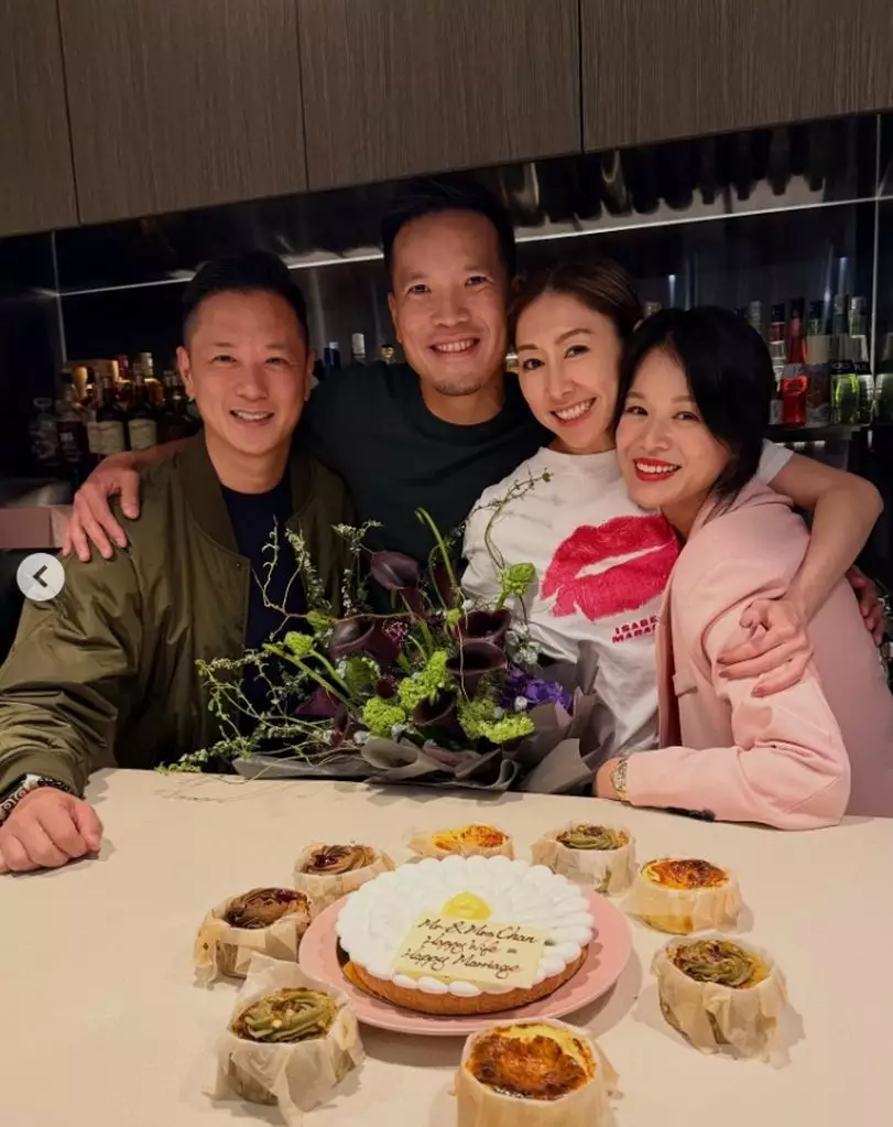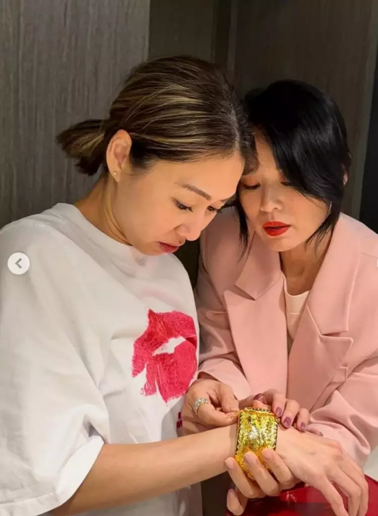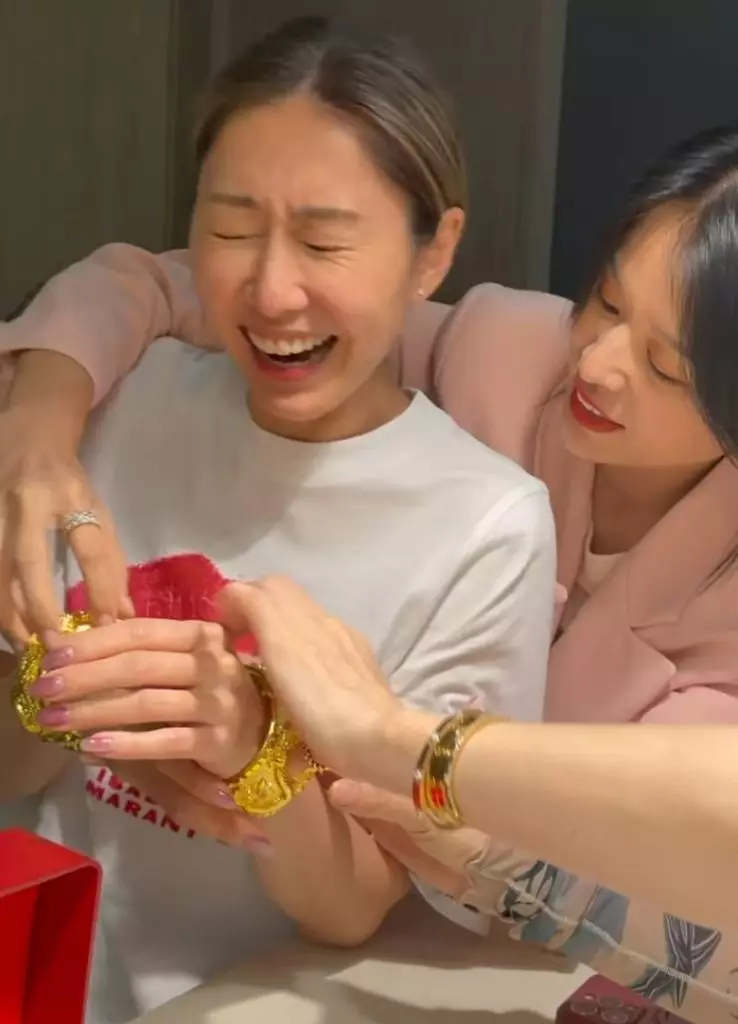 視后胡定欣本月初嫁醫生男友陳健華,新婚返港後即相約好友慶祝。日前她在社交平台分享聚會片段,透露獲好姊妹胡杏兒與老公李乘德送上極具分量的龍鳳鈪作賀禮,興奮表示:「好姊妹果然係講得出做得到,佢真係打咗對龍鳳鈪俾我做禮,無論金價有幾高,我都會好好收藏!Thank you Sis!~ 哈哈!下次要戴住岀Show!!」
