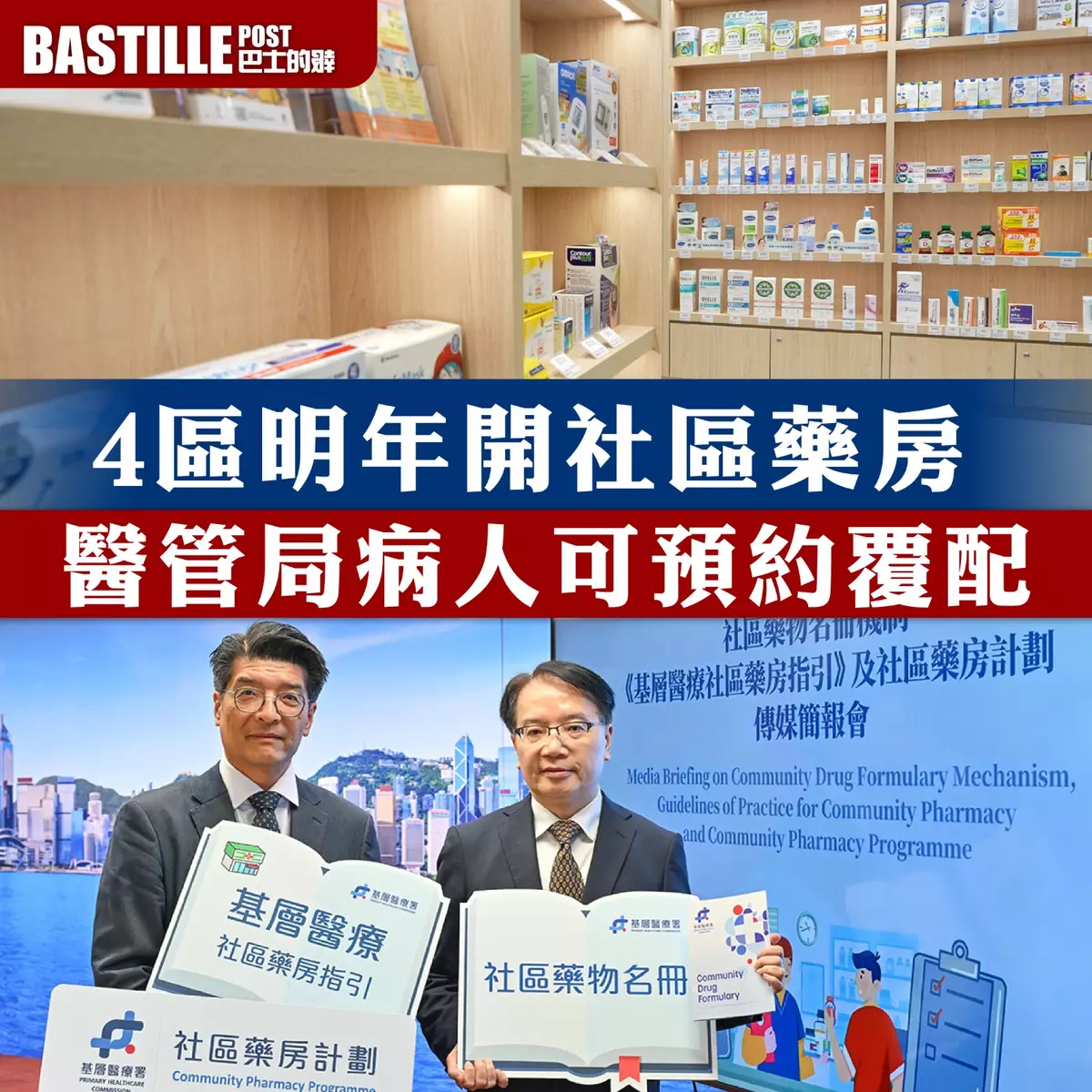 社區藥房計劃明年第四季推行,基層醫療署公布社區藥物名冊運作機制,並推出《基層醫療社區藥房指引》。醫務衞生局公布,社區藥房首階段招標會在未來1至2個月進行,先為東區、油尖旺、沙田及元朗區招聘,預計明年第四季,有關4區可開展社區服務。到2027年第四季,全港18區各有4至5間社區藥房。