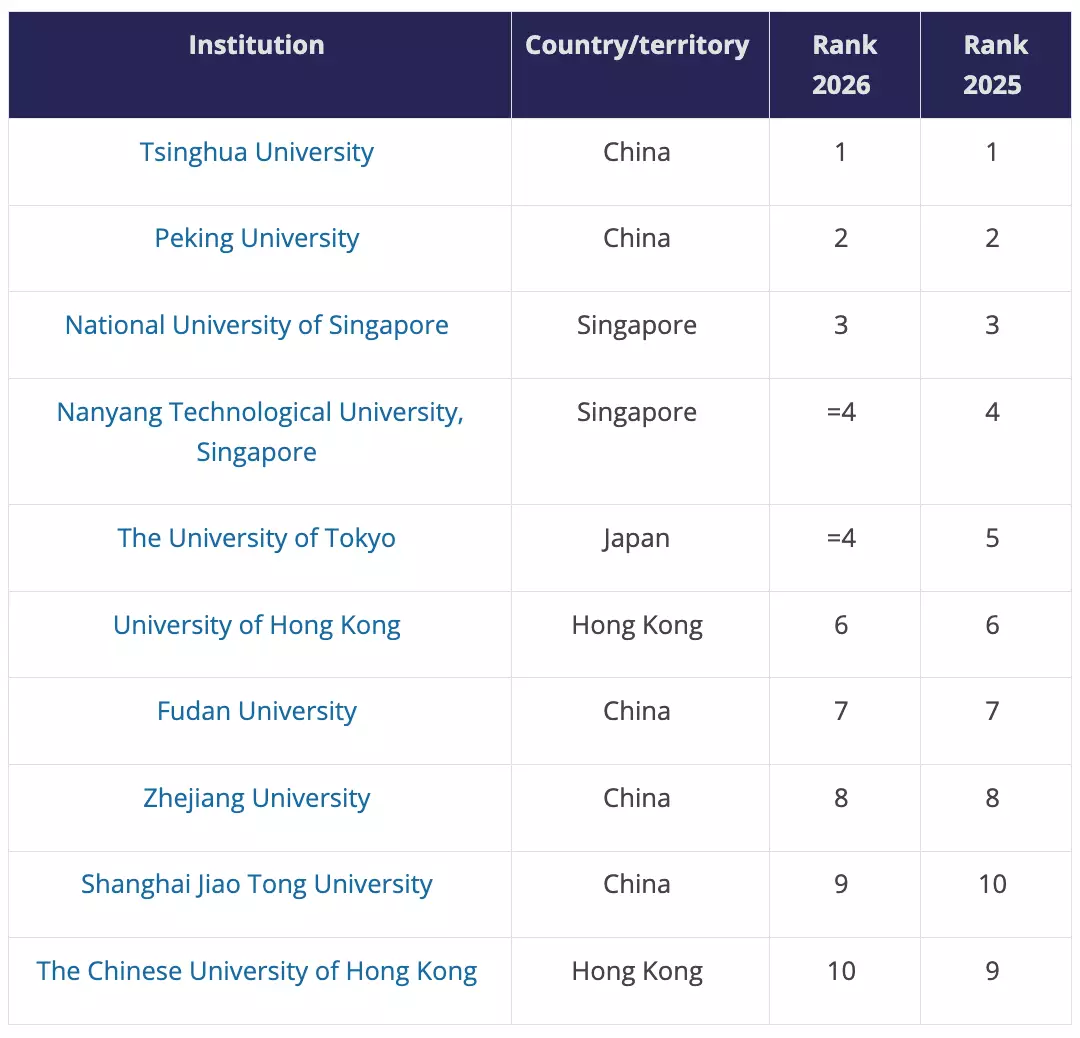 2026年《泰晤士高等教育》(Times Higher Education,THE)亞洲大學排名涵蓋36個國家或地區共有929所高校,首10位大學一半院校來自中國內地,包括榜首頭兩位的清華大學和北京大學,以及上海復旦大學(7)、浙江大學(8)和上海交通大學(9)。新加坡兩間大學,新加坡國立大學及南洋理工大學分列第3、4位,日本東京大學排名第5,香港大學及香港中文大學分別排第6及第10位。