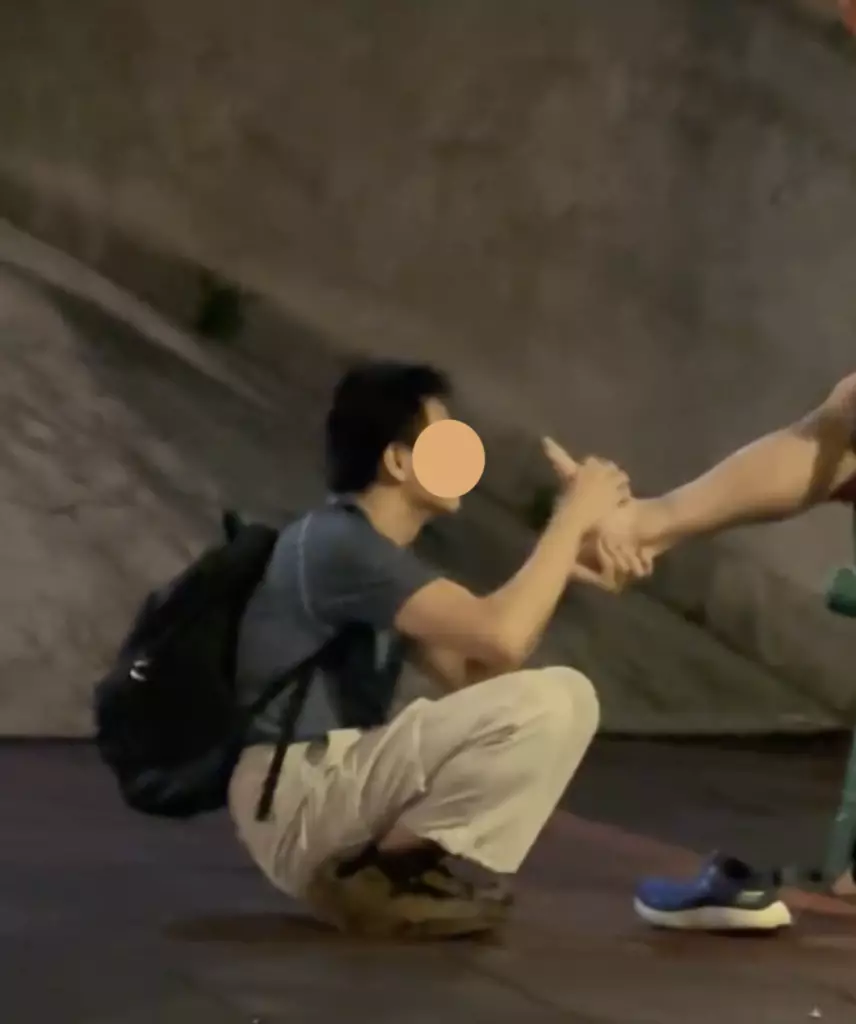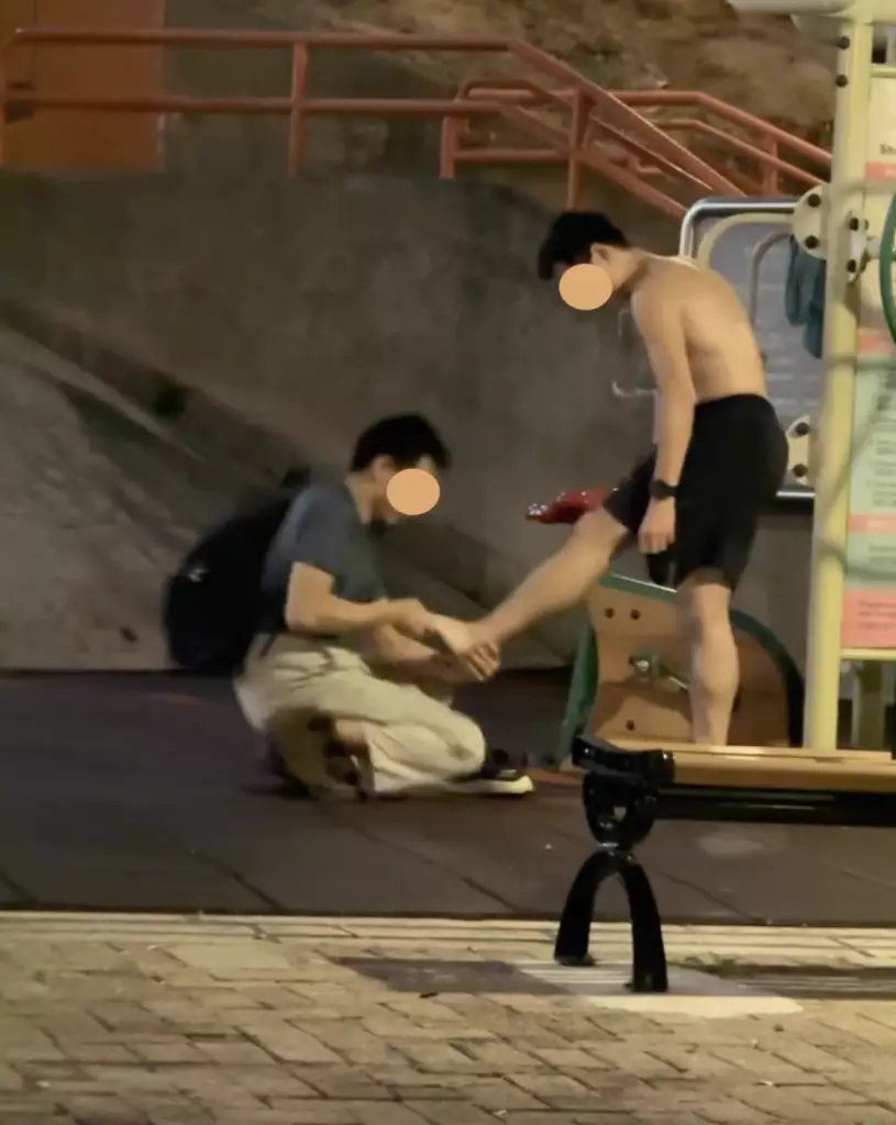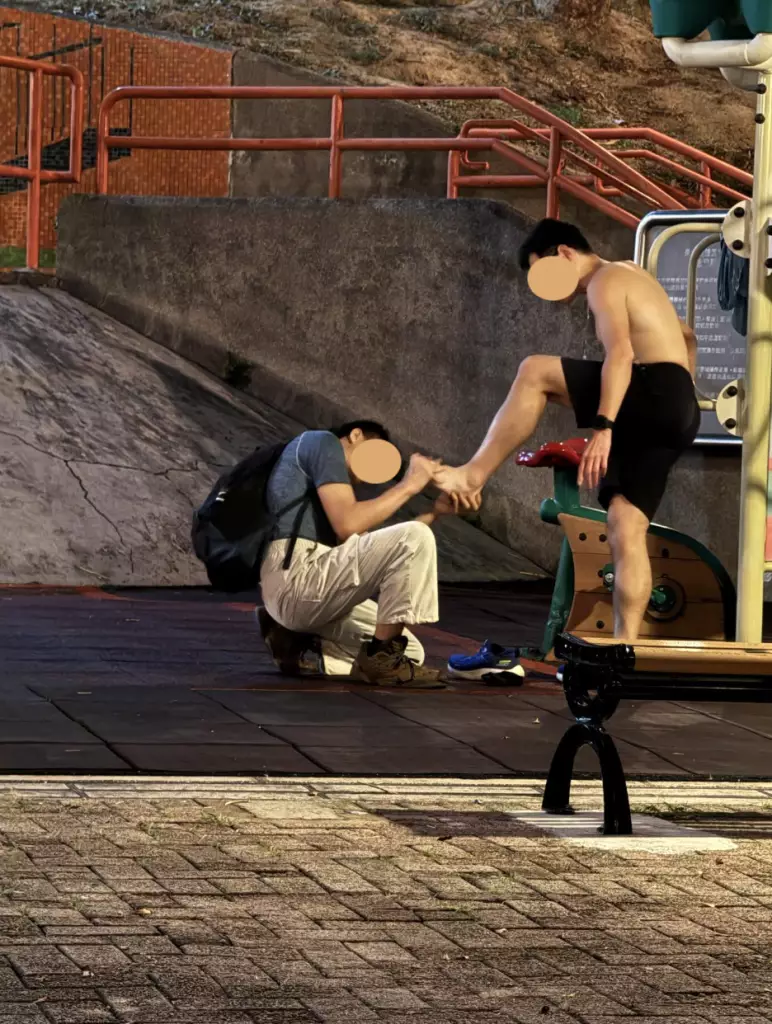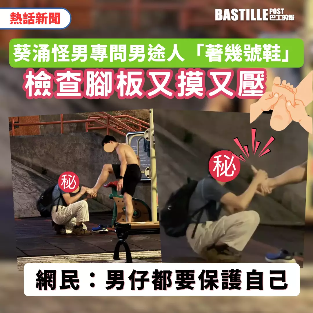 據樓主上傳的影片顯示,一名身穿藍色上衣、背著背囊的中年男子,在公園健身設施旁向一名赤膊男途人搭訕,詢問對方「著幾號鞋」,其後說服該男子脫鞋,並提起其腳掌不斷觸摸按壓,同時喃喃自語「好大,好大,隻腳好大喎!」過程被拍下上網。