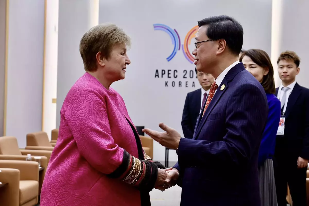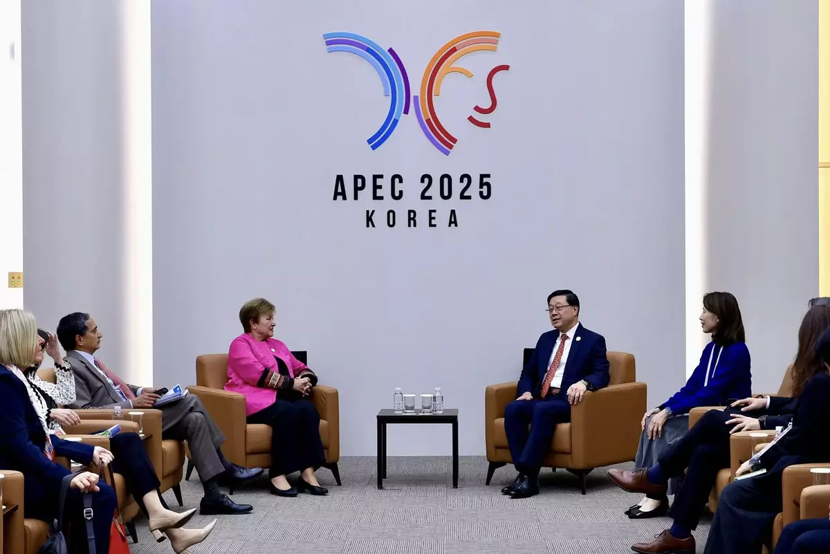 正在南韓慶州出席亞太經合組織會議的行政長官李家超,與國際貨幣基金組織(IMF)總裁格奧爾基耶娃會面。