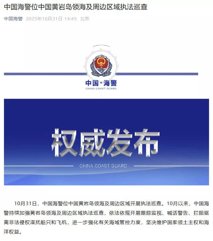 10月以來,中國海警持續加強黃岩島領海及周邊區域執法巡查,依法依規開展跟蹤監視、喊話警告、攔阻驅離非法侵權滋擾船隻和飛機,進一步強化有關海域管控力度,堅決維護國家領土主權和海洋權益。
