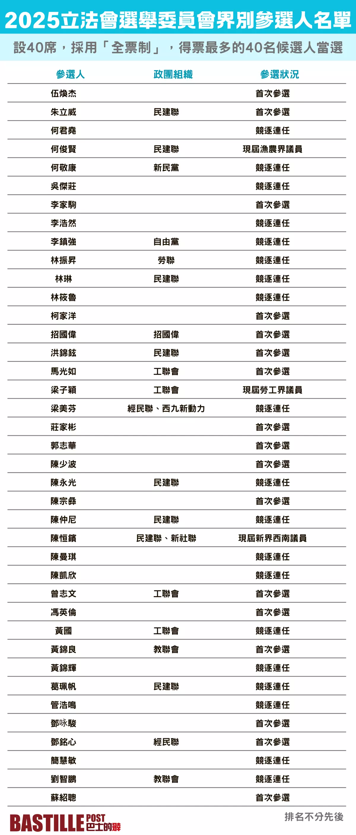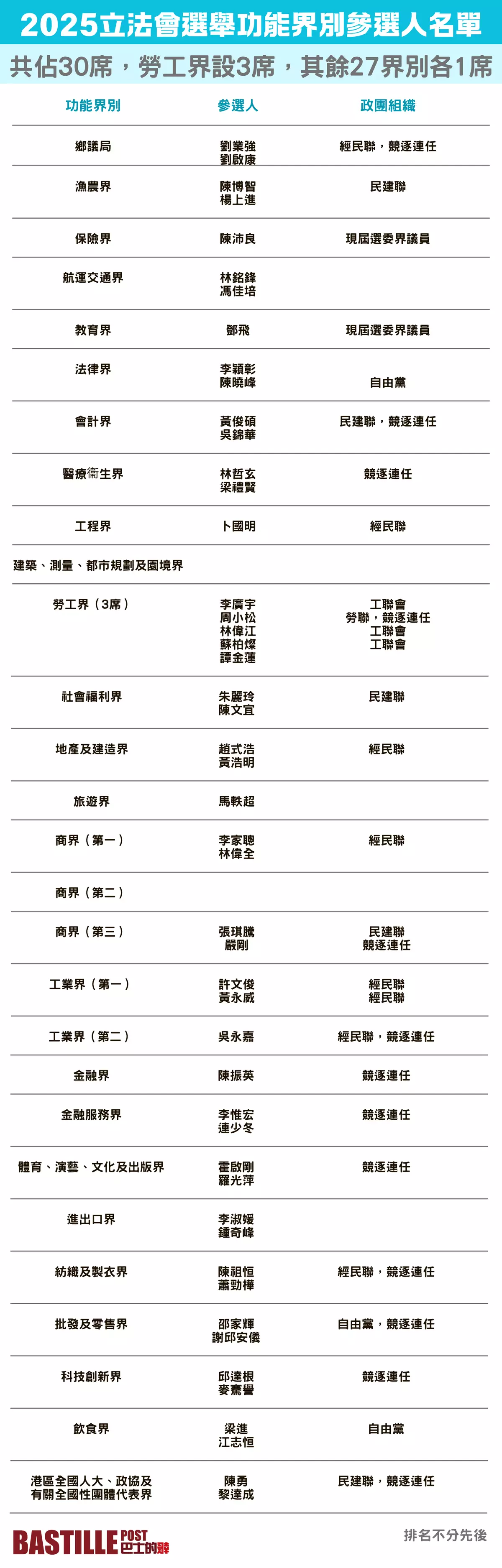 2025年立法會換屆選舉的10個地方選區、28個功能界別以及選舉委員會界別的選舉主任10月31日共接獲25份提名表格。