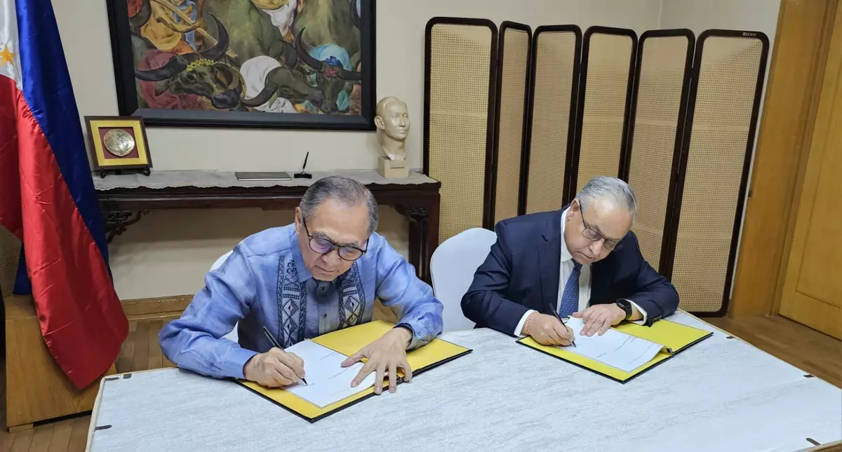 菲律賓駐華大使弗古律斯(左)早前和VFS Global中國、香港及蒙古行政總裁辛格就電子簽證簽署合作備忘。菲律賓駐華大使館圖片