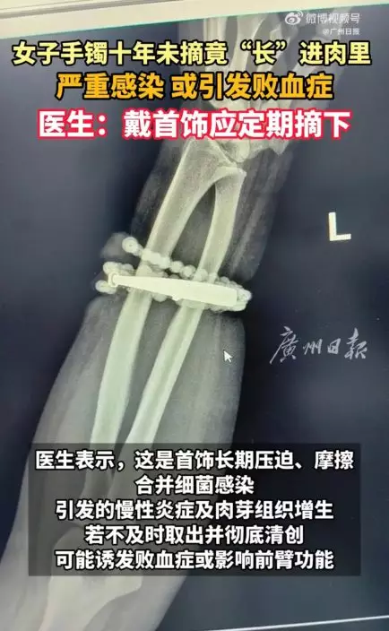 直至兩周前,龔女感到手腕劇痛並滲出膿液,檢查後驚見手鐲部分已深深嵌入皮膚,導致嚴重感染與化膿,完全無法自行取下,情況危急,遂立即趕往醫院求診。