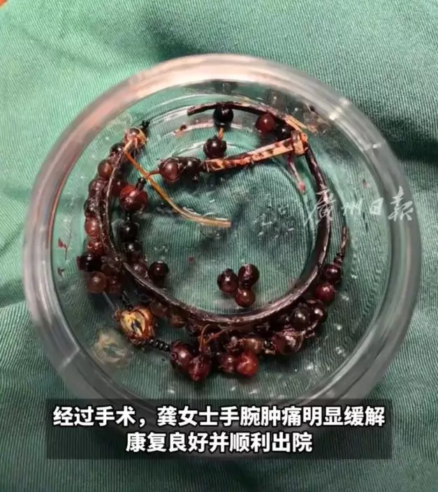 寧德市閩東醫院創傷骨科及手顯微外科團隊隨即為龔女檢查,結果發現她的前臂皮膚紅腫潰爛,組織增生形成一圈「肉環」,緊緊包裹著銀手鐲與串珠,並散發惡臭與膿性分泌物。副主任醫生黃其龍指出,這是首飾長期壓迫及摩擦,加上細菌感染所導致的慢性發炎與肉芽組織增生,若不及時手術取出,感染或會擴散至深層組織,最嚴重可引發敗血症或造成手臂功能喪失。