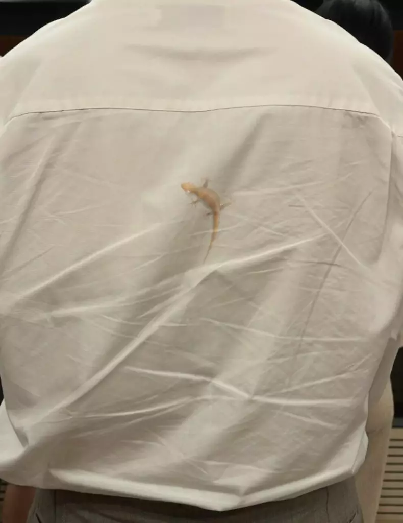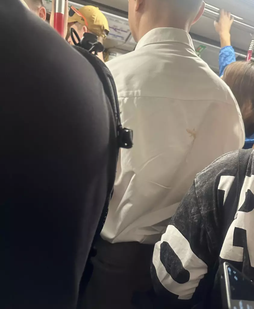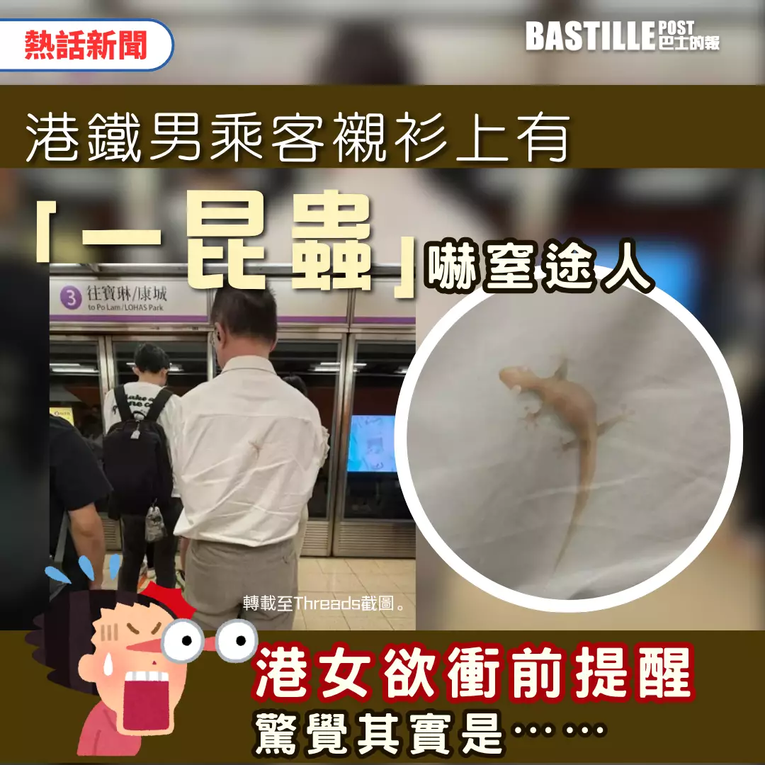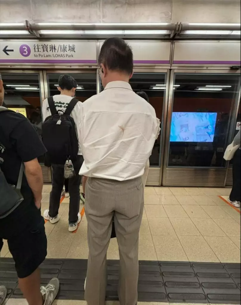 事主在Threads發文稱,於港鐵月台見前方男乘客的淺色襯衫背面,有一隻淡黃色四腳蛇圖案,「諗住行去提下佢,行近啲睇發現,X,流嘅」,坦言被逼真圖案嚇到卻又覺得有趣。