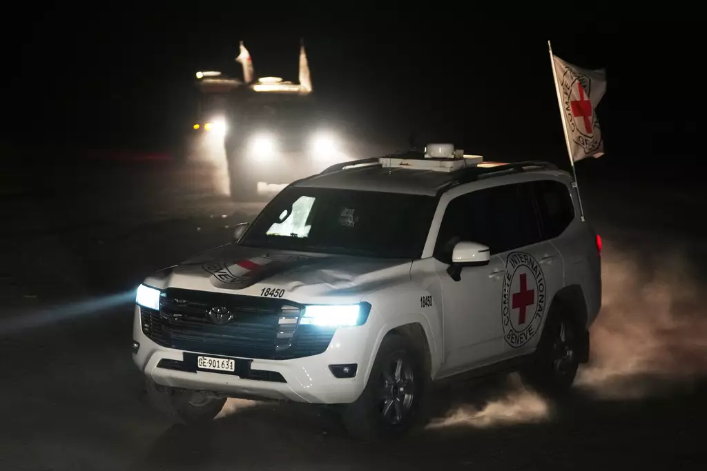 星期日載有三具人質遺體的紅十字會車輛駛向以色列邊境口岸,準備移交給以色列當局。AP圖片