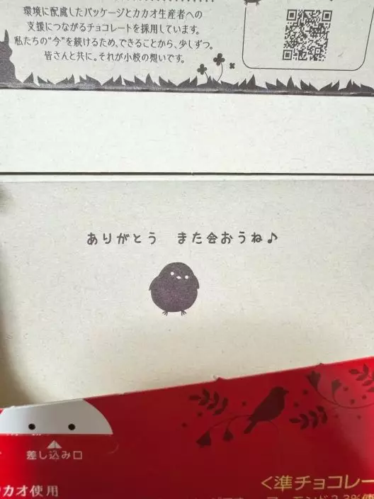 母親過世後,女子將朱古力保留至今,即使早已過了保存期限,也仍捨不得食用。直至某日,她再次打開盒蓋,才注意到內側印著一行字:「ありがとう また會おうね(謝謝你,我們之後再見喔)」。那一刻,她瞬間明白母親當年的用意,不禁當場落淚:「原來如此,這盒子真的很漂亮啊……」