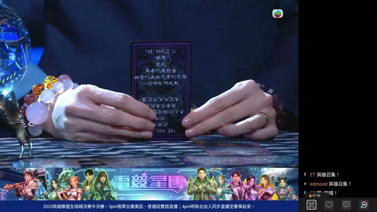 前晚(1日)節目開始羅泳嫻(裸泳)以塔羅牌為兩隊參戰隊伍KT及GEN.G作賽事預測,她說︰「今日比賽兩隊,有一隊攞到『意外牌』一開始會出錯同埋多意外,要追返上去都有啲困難,會陷入苦戰。而另一隊就攞到火屬性『奮進』牌,代表一開始就心口掛『勇』字,一路殺落去。而今晚勝出隊伍件衫會係深色。」裸泳同時為勝出一隊抽到「幸福滿足」同「世界牌」,意味該隊會在領袖帶領下,在總決賽會再下一城成為冠軍。當晚賽事一如裸泳所料,賽前奪冠大熱門GEN.G在第一局出現意外先失一局,雖然扳回第二局,之後卻連輸兩場,KT順利晉身總決賽,無獨有偶勝出一方的隊服正好是深色。