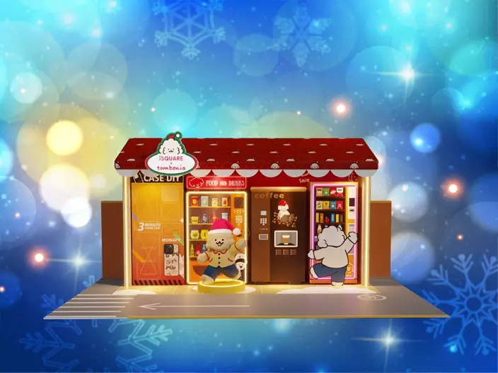 大堂樓層iEXHIBITION的萌Muck聖誕販機站,襲來日系的都會聖誕氣氛,Muck仿佛是日本街頭遇上的老朋友,帶我們在售賣機前選購飲品零食。