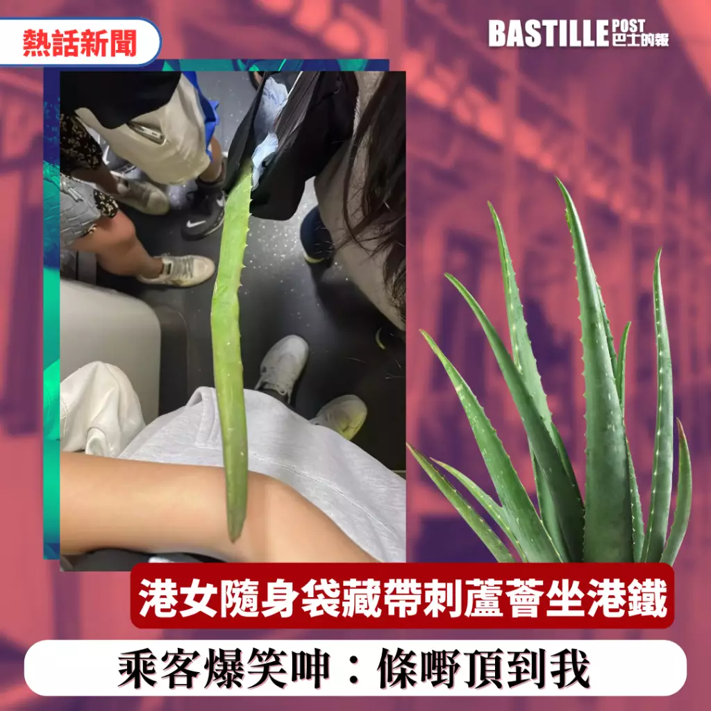 本港不時都有乘客攜帶另類物品搭乘港鐵的新聞,近日有網友就在網上撰文,指自己乘搭港鐵時被身旁乘客袋中伸出的帶刺長蘆薈頂到手臂。他搞笑拍下照片並寫道:「呢位乘客,你條嘢頂到我」,圖文曝光掀起網民熱議。