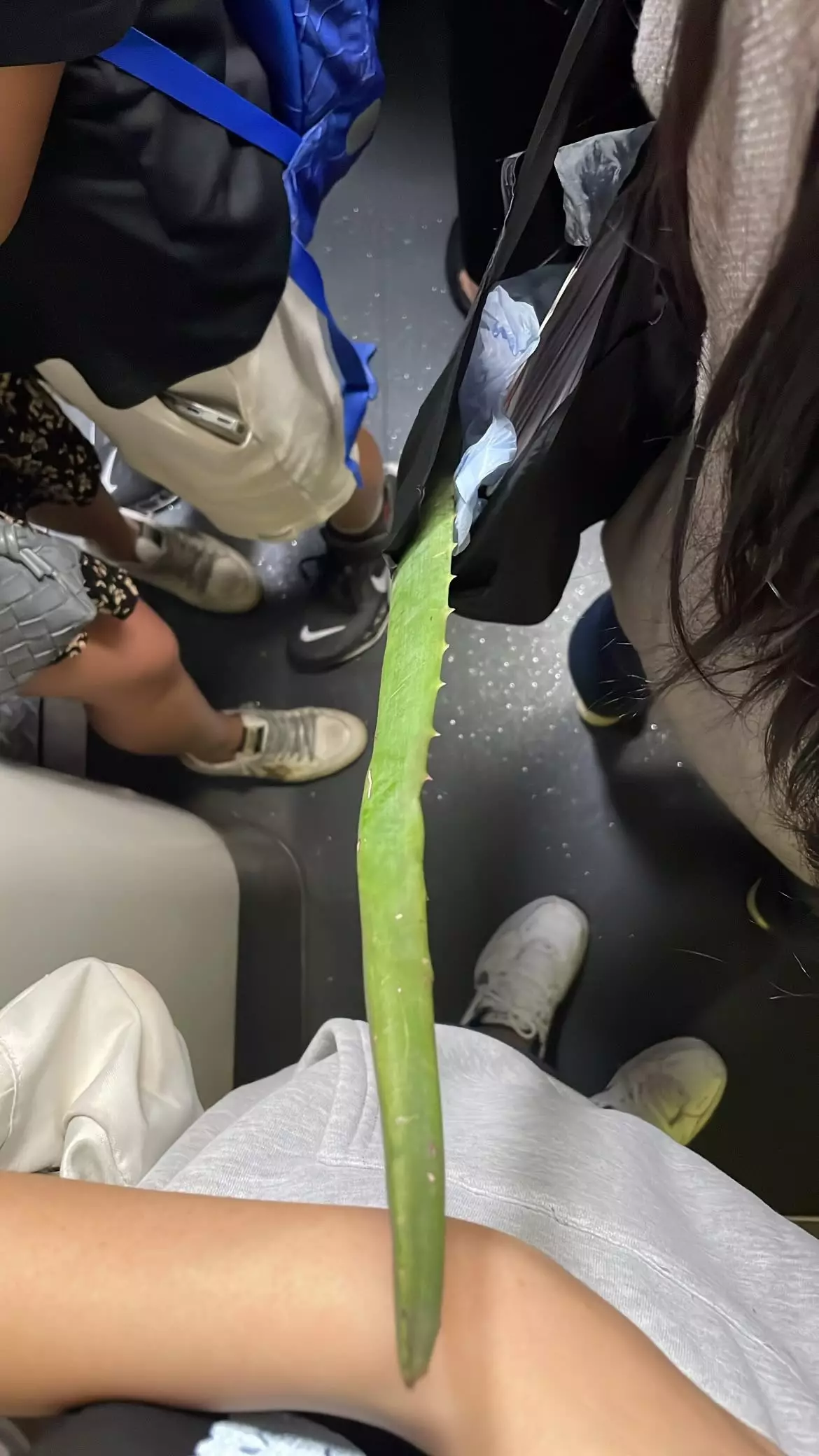 據事主公開的照片顯示,在擁擠的港鐵車廂內,一名穿粉紅色上衣的乘客左肩斜揹着袋,袋中打斜伸出一條長約30厘米的帶刺蘆薈,蘆薈更直接觸碰到事主手臂。