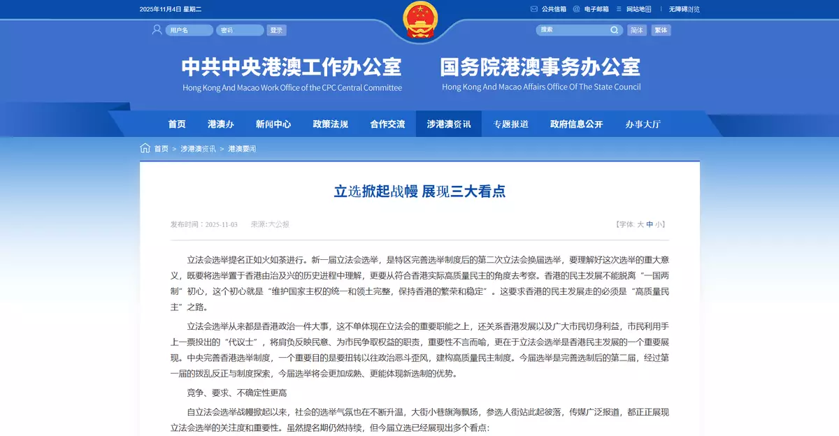 港澳辦轉載《大公報》文章題為「立選掀起戰幔 展現三大看點」,文章說新一屆立法會選舉,是特區完善選舉制度後的第二次立法會換屆選舉,經過第一屆的撥亂反正與制度探索,今屆選舉將會更成熟、更能體現新選制的優勢。