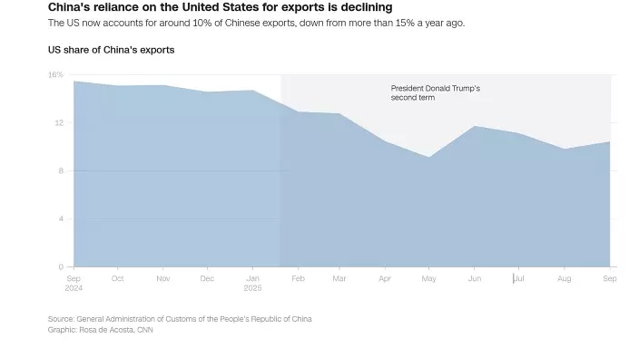 9月份,中國對美國的出口總額為343億美元,而去年同期為470億美元,下降了27%。CNN指「與1年前的15%相比,如今美國佔中國出口貿易的10%左右」。