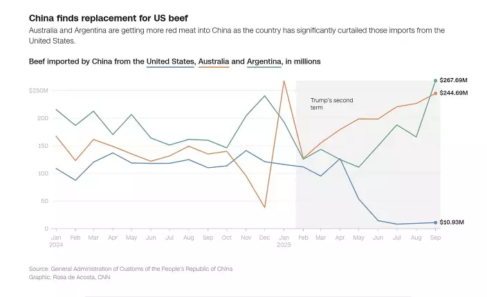 之後,CNN的第三張和第四張圖表,是中國進口美國大豆和牛肉的情況,統計範圍是2024年1月至2025年9月,顯示中國不僅實現出口多元化,還在從其他國家進口更多產品,以尋求美國商品的替代品。