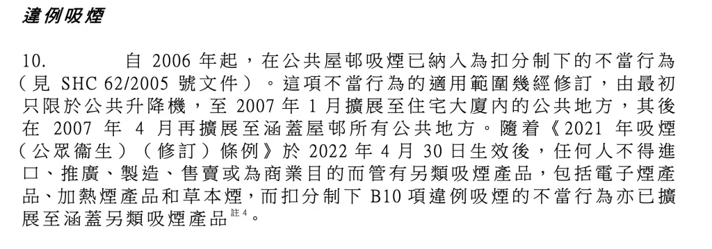 根據房委會「屋邨管理扣分制」,僅針對「在屋邨公共地方吸煙或攜帶燃着的香煙,以及已啟動的另類吸煙產品(如電子煙、加熱煙產品和草本煙)」扣5分,因此在住宅單位內吸煙並不屬於扣分範圍。電梯大堂、電梯內、走廊等公共地方則屬禁煙區域,煙民需特別留意。