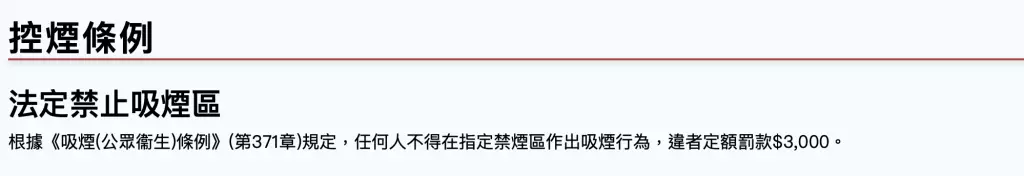 而根據香港法例第371章《吸煙(公眾衛生)條例》,住宅單位屬私人空間,並非法定禁煙區;公共地方包括電梯大堂、走廊、樓梯及室外休憩區域等則受規管。由2026年1月1日起,在法定禁煙區吸煙的定額罰款將增至3,000元。
